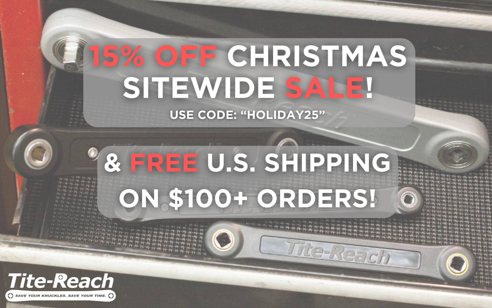 Tite-Reach tools on wood, next to a blue banner with a truck icon, announcing FREE SHIPPING on US orders over $100.